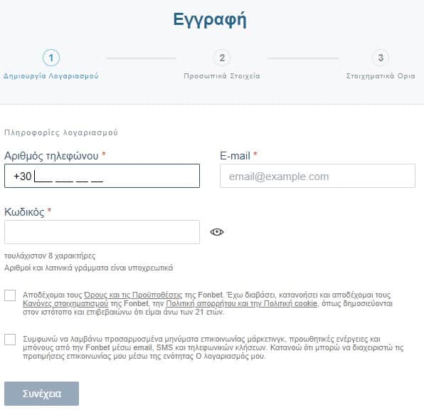 Αρχικά, πληκτρολογείς τη Fonbet για να μπεις στην αρχική της σελίδα. Αφού καταφέρεις και μεταβείς, τότε θα παρατηρήσεις στο δεξί πάνω μέρος της στοιχηματικής να αναγράφεται η επιλογή «Εγγραφή» (ΒΗΜΑ 1). Την πατάς και περνάς στο πρώτο μέρος της δημιουργίας λογαριασμού (ΒΗΜΑ 2). Όπως θα δεις, πρέπει να σημειώσεις τον αριθμό τηλεφώνου, το e-mail, τον κωδικό, καθώς να αποδεχτείς τους Όρους - Προϋποθέσεις της Fonbet.