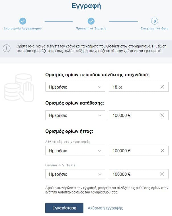 Έπειτα, περνάς σε άλλη σελίδα που θέλει, επίσης, προσωπικά σου στοιχεία, τα οποία πάλι πρέπει να είναι αληθινά. Βάζεις ονοματέπωνυμο, ημερομηνία γέννησης, φύλο, επιλογή εγγράφου (συνήθως ο αριθμός ταυτότητας), ιθαγένεια, πόλη, ταχ. κώδικας και διεύθυνση (ΒΗΜΑ 3). Έπειτα, πατάς επόμενο βήμα και σου εμφανίζονται τα όρια (ΒΗΜΑ 4), τα οποία βάσει δική σου κρίσης τα ρυθμίζεις.