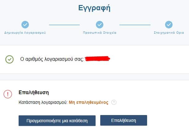 Τελειώνεις με τα όρια και στη συνέχεια πατάς «Εγκατάσταση». Τότε θα σου εμφανιστεί ο αριθμός λογαριασμού, ωστόσο η εγγραφή δεν θα είναι επιβεβαιωμένη, καθώς χρειάζεται να καταθέσεις χρήματα (ΒΗΜΑ 5) για να ολοκληρωθεί πλήρως η εγγραφή.