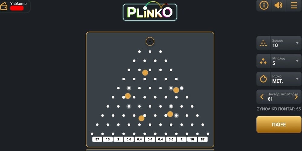 Πως παίζεται το Plinko όμως; Αφού ο παίκτης επιλέξει το επίπεδο δυσκολίας (μεταβλητότητας) στην οθόνη θα εμφανιστεί ένα ταμπλό με κυκλάκια τοποθετημένα σε μοτίβο πυραμίδας. Έπειτα ο παίκτης πρέπει να επιλέξει πόσα μπαλάκια θα πέφτουν με κάθε πάτημα καθώς και το κόστος της κάθε μπάλας. Για παράδειγμα, αν επιλέξει κάθε πάτημα να περιλαμβάνει 10 μπάλες και κόστος 0,30€ τότε η αξία κάθε γύρου θα είναι 3€.