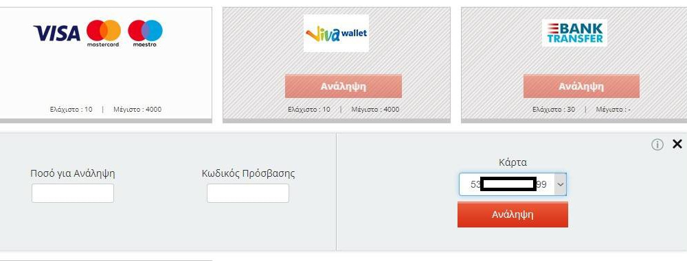 Στο παράδειγμα της φωτογραφίας, έχει χρησιμοποιηθεί χρεωστική κάρτα, viva wallet και Paysafecard. Όμως η τελευταία κατάθεση πραγματοποιήθηκε μέσω της χρεωστικής κάρτας που τελειώνει σε ΧΧ99, οπότε αυτή θα χρησιμοποιηθεί για την ανάληψη μας.