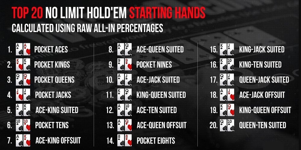 Η επιλογή των αρχικών φύλλων που επιλέγεις να παίξεις είναι ένα από τα βασικά στοιχεία του παιχνιδιού σου. Το ποιο είναι το range των φύλλων με τα οποία αποφασίζεις να συμμετάσχεις σε μια παρτίδα καθορίζει το στυλ σου αλλά και την εμπειρία σου. Όλοι ξέρουν πως το καλύτερο φύλλο είναι οι Άσοι. Από κει πέρα γνωρίζεις την δυναμική των φύλλων; Ας δούμε μαζί τα 20 καλύτερα αρχικά φύλλα και μετά θα εξηγήσω πως η δύναμή τους αλλάζει με την προσθήκη άλλων σημαντικών παραγόντων.