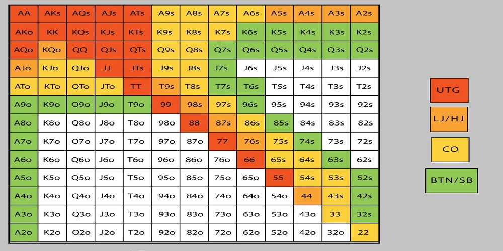 Όπως είναι φυσιολογικό στην αρχή δεν θα νιώθεις πολύ σίγουρος για το παιχνίδι σου. Ένας τρόπος να μειώσεις αυτή σου την ανασφάλεια είναι να παίζεις μόνο πολύ δυνατά αρχικά φύλλα και να έχεις υπομονή. Φυσικά το ποια φύλλα πρέπει να παίζεις εξαρτάται από την θέση στην οποία βρίσκεσαι. Σου παραθέτω έναν πολύ χρήσιμο πίνακα για να έχεις μια γενική εικόνα των φύλλων που πρέπει να παίζεις ανάλογα με την θέση σου.